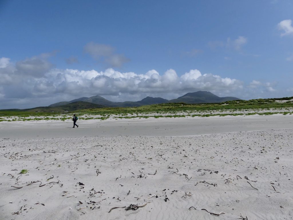 We then continued south on a track through the dunes and machair, eventually coming down to the beach for our return just before the track joins a road. The Hebridean Way continues south-west from here (there’s a finger sign on the road) and so it would be easy to extend your walk at this point. We walked back on the beach, which was wide, beautiful and completely deserted.
